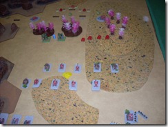 The terrain was layout as follows. There was a ruin town/city on the left flank about 30cm in.This had a road running through it and that exit at three ends and the other ending in a dead end. Also layout was rugged terrain that was passable through the gaps, along with hills and forest.