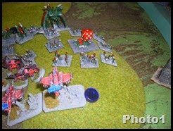 - KWL do a engage action with paladin unit and use the commander rule and bring the Lancer unit into(Photo1) and clipping three units and calls intermingled(Photo2).After the dice are rolled the UKT have lost and three units are broken(Photo3) and flee back to their deployment zone.