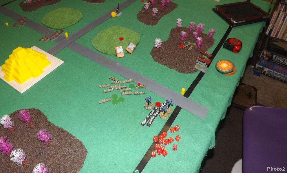 - Thousand Sons do a engage action with SCARAB OCCULT and target the GARGANT(Supporting fire from WARBAND)(Photo1)The dice are rolled and the SCARAB OCCULT(Broken) wins the combat and the GARGANT(2DC) is BROKEN(Photo2).The SCARAB OCCULT flees back and the GARGANT flee behind hill. WARBAND gets BM for failed assault(Photo3)..BM not shown in pic.